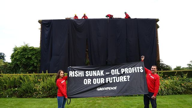 Gli attivisti di Greenpeace sono saliti sul tetto della villa del premier conservatore britannico Rishi Sunak a Kirby Sigston, nel North Yorkshire, e l'hanno ricoperta con teli di tessuto nero. L'organizzazione ambientalista ha agito in segno di protesta contro il "sostegno del primo ministro all'espansione delle trivellazioni di petrolio e gas nel Mare del Nord". Gli ecologisti hanno inoltre esposto la scritta "Rishi Sunak - I profitti del petrolio o il nostro futuro?". Sul posto sono intervenuti gli agenti di polizia.