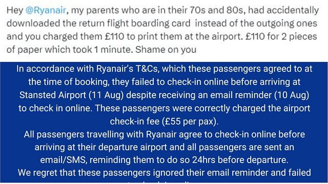 Il messaggio di Ryanair - "I passeggeri hanno accettato i termini e le condizioni di Ryanair al momento della prenotazione. Tuttavia, non hanno effettuato il check-in online prima di arrivare all'aeroporto di Stansted (11 agosto) (e hanno anche ricevuto un promemoria via e-mail (10 agosto)). A questi passeggeri è stata correttamente addebitata la tariffa per il check-in in aeroporto (£55 a persona)", ha scritto Ryanair su Twitter.