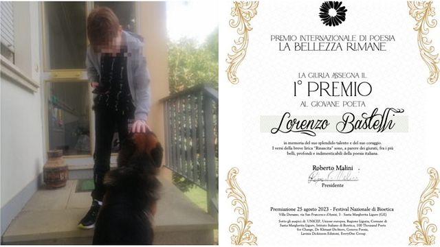 La poesia - La giuria è rimasta profondamente colpita dall'opera di Lorenzo, che ha ricevuto il primo premio non solo in memoriam, ma anche perché autore della poesia più bella fra le 1.200 pervenute alla giuria. "Con versi intensi, originali, emozionanti, Lorenzo ha descritto il percorso della sua lotta e della sua rinascita", si legge nelle motivazioni al premio. Ecco i versi scritti da Lorenzo: "Io sono stato/ fiammifero decapitato/ I ricordi/ torturavano il cuore// Le mani/ convulse tra loro/ lottavano// MA// Io sono/ una farfalla/ a fatica rinata// Respiro/ finalmente/ l'azzurro// Posso/ dormire sereno/ nella mia culla". La premiazione si terrà il 25 agosto a Santa Margherita Ligure, nell'ambito del festival nazionale di Bioetica.