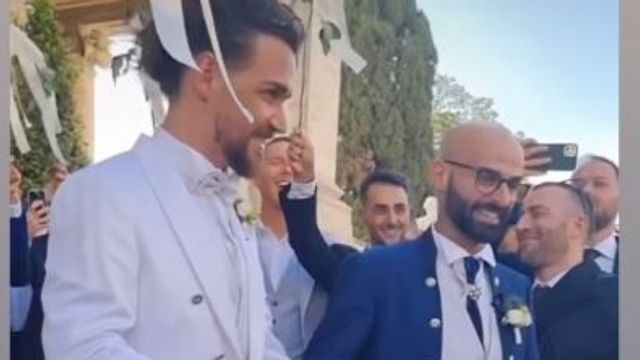 Il cantante si è presentato con un elegante completo bianco con la giacca impreziosita da un lungo strascico, mentre Luigi ha optato per un classico completo blu. Le emozioni non sono mancate: i due si sono tenuti sempre per mano e hanno tagliato insieme il nastrino bianco fuori dalla sala, prima di essere inondati dalla tradizionale pioggia di riso. Gli invitati hanno poi lanciato alcuni palloncini blu nel cielo e fatto passare i due sposini sotto una "galleria" formata da romantiche rose bianche a gambo lungo. Gli invitati hanno immortalato tutte le fasi della giornata, dall'arrivo degli sposi alla festa che è andata avanti fino a notte fonda tra fuochi d'artificio e balli, creando un ricco album di nozze social.