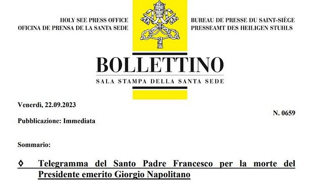 Papa Francesco ha espresso il suo cordoglio per la morte di Giorgio Napolitano con un telegramma indirizzato alla moglie dell'ex presidente della Repubblica, la signora Clio Bittoni Napolitano. "La scomparsa di suo marito ha suscitato in me sentimenti di commozione e al tempo stesso di riconoscenza per questo uomo di Stato che, nello svolgimento delle sue alte cariche istituzionali, ha manifestato grandi doti di intelletto e sincera passione per la vita politica italiana, nonché vivo interesse per le sorti delle nazioni", ha scritto Bergoglio.