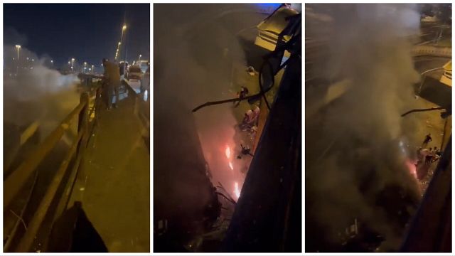 Il mezzo si vede mentre brucia con tanto fumo, e si vedono anche i bagliori delle fiamme, è rovesciato di lato con i finestrini dalla parte del guidatore verso l'alto. Nelle primissime immagini affidate ai cellulari dei testimoni, tanto che non sono ancora arrivati i soccorsi ma si sentono le sirene di decine di mezzi che stanno convergendo sul luogo dell'incidete, si vedono alcune persone che sono attorno al pullman ma non si possono avvicinare per le fiamme e per il calore sviluppato dalle lamiere incandescenti.