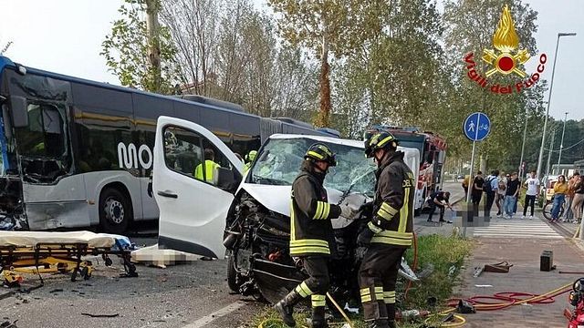 A Montebelluna, in provincia di Treviso, un furgone e un bus di linea si sono scontrati frontalmente. Il bilancio del drammatico incidente è di due morti e di tre feriti. Le due persone decedute e il ferito ricoverato in rianimazione si trovavano sul furgone. Lesioni meno gravi per l'autista del pullman e uno dei sei passeggeri a bordo.