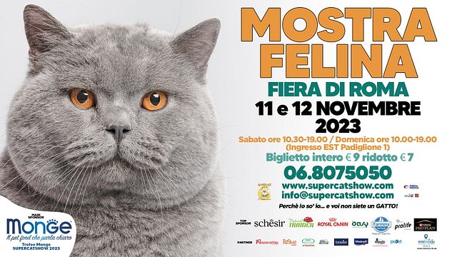 “Perché io so’ io e voi non siete… un gatto!” è lo slogan di SuperCat Show 2023, la mostra felina internazionale in programma sabato 11 e domenica 12 novembre presso la Nuova Fiera di Roma (Ingresso EST, Padiglione 1), giunta alla 25° edizione. Due giorni di sfilate di vanità, mostre, adozioni del cuore, miao-mercatino, giochi interattivi, spettacoli per grandi e piccini, con i gatti sempre grandi protagonisti.
