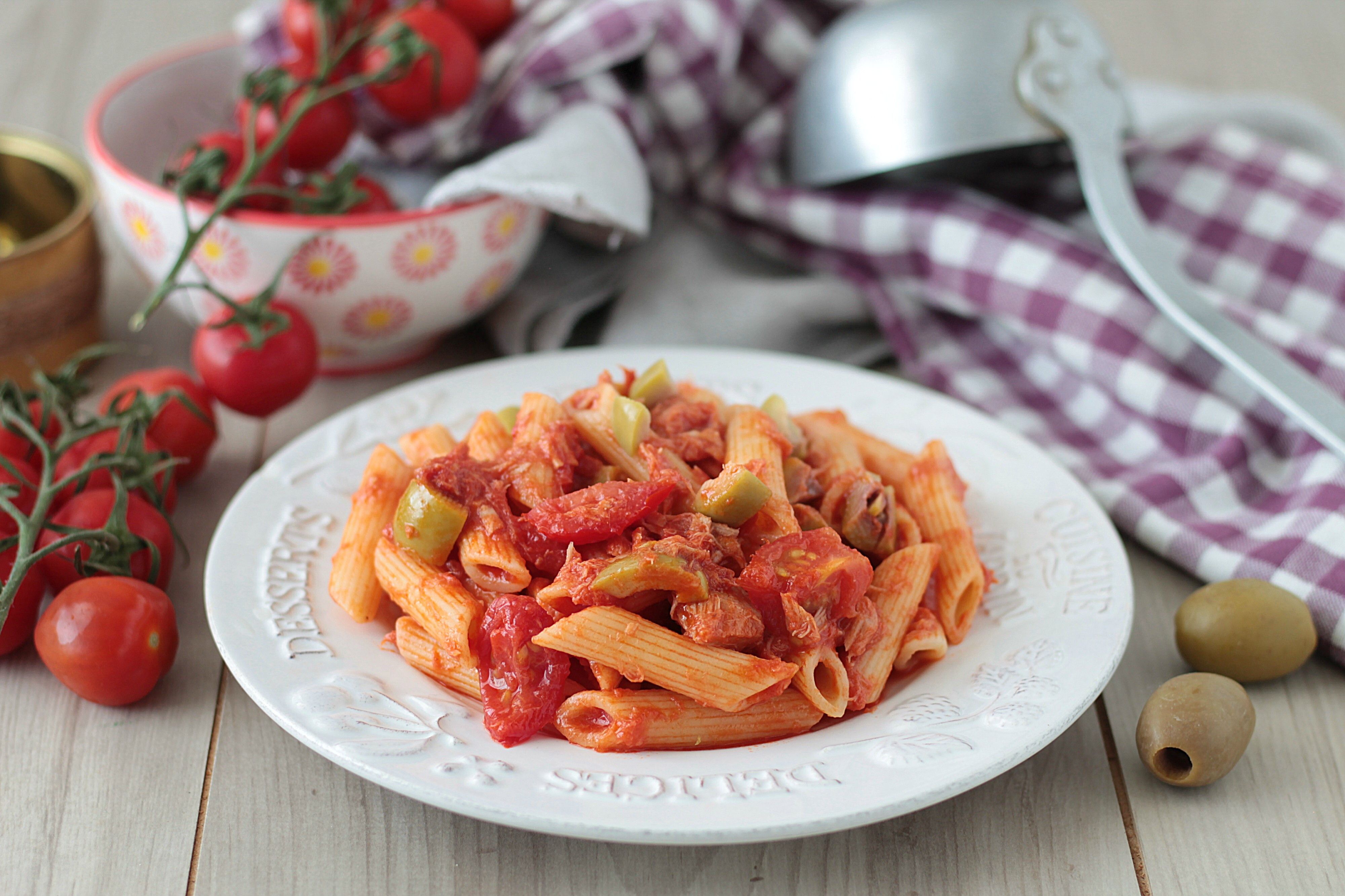 Ingredienti per una persona: 80 g di penne, 1 scatoletta di tonno sott’olio, 1 acciuga sott’olio, 15 g di olive verdi denocciolate, 15 g di pomodorini, 1-2 cucchiai di pomodoro concentrato, 1 pizzico sale e pepe, 1 spicchio d’aglio, qb olio extra vergine d’oliva, qb origano