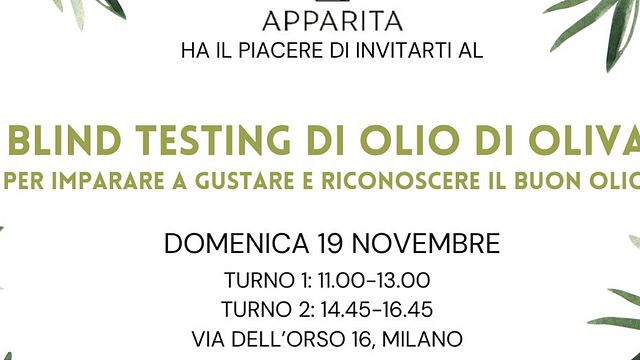 Blind testing di olio di oliva: è l'iniziativa organizzata dall'azienda agricola Apparita per imparare a gustare e riconoscere il buon olio. Domenica 19 novembre, in via dell'Orso 16, a Milano, un agronomo esperto di olivocultura e assaggiatore professionista guiderà i presenti nella degustazione per imparare a riconoscere gli oli di qualità in base all'esperienza sensoriale (esame gustativo e olfattivo) e alle caratteristiche chimico-fisiche (analisi di laboratorio).