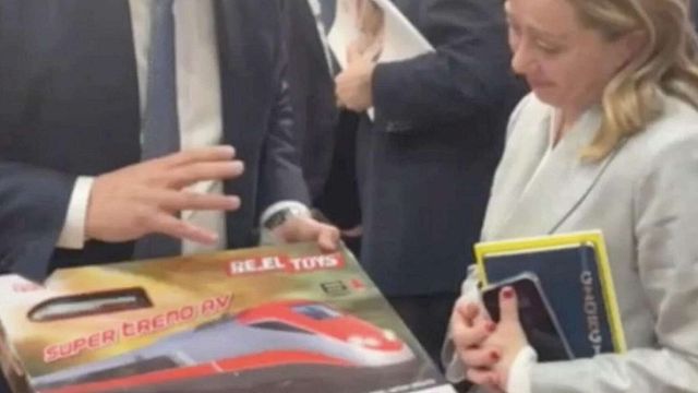 Il segretario generale della Uil, Pierpaolo Bombardieri, ha portato un Frecciarossa a batterie come regalo a Salvini, perché "più precetta e più le nostre piazze si riempiono", e così "se eventualmente vuole bloccare i treni, può chiamare Lollobrigida". Il modellino però è finito nelle mani del premier: "Loro sono andati via prima - spiega Bombardieri - quindi ho chiesto alla presidente del Consiglio se potevo approfittare della sua gentilezza per dare questo regalo a Salvini. E' stata al gioco".