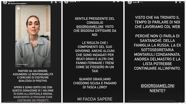 Fedez ha approfittato del video pubblicato dalla moglie Chiara Ferragni, in merito alla vicenda del pandoro griffato e la multa inflitta dall'Antitrust, ha annunciato una donazione di un milione di euro all'ospedale Regina Margherita. Dal palco di "Atreju", Ferragni è stata criticata da Giorgia Meloni. "Visto che ha trovato il tempo di parlare di noi che lavoriamo col web, perché non ci parla di Santanché, della famiglia La Russa, la ex sottosegretaria Montaruli condannata, Andrea Delmastro, e la lista potrebbe continuare all'infinito. Niente? Due paroline su di loro niente?", aveva replicato il rapper sempre su Instagram. "Eh le priorità del Paese cara presidente del Consiglio Giorgia Meloni. Ci vediamo al Family Day con Elon Musk", aveva poi concluso polemicamente.