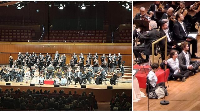 Blitz di Ultima Generazione all'Auditorium Parco della Musica di Roma: gli attivisti della Campagna "fondo di riparazione" hanno bloccato l'esecuzione del "Messia" di Handel, dell'Accademica Nazionale di Santa Cecilia. Al momento dell'Allelujah, tre attivisti sono saliti sul palco con delle magliette bianche con scritto "Fondo riparazione ora. Le note della catastrofe Lo spettacolo non può continuare", per portare "un grido" di allarme: "Questo non è un Natale di gioia", l'umanità "ha aperto le porte dell'inferno come denunciato dal segretario generale dell'Onu", hanno detto sedendosi ai piedi di John Nelson, direttore d'orchestra. Il concerto, dopo che gli addetti alla sicurezza hanno allontanato gli attivisti, è poi proseguito.