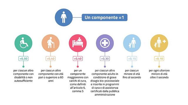 Questo parametro è pari a 1 per il nucleo familiare ed è incrementato fino a un massimo complessivo di 2,2 ulteriormente elevato a 2,3 in presenza di componenti in condizione di disabilità grave o non autosufficienza. Se il nucleo familiare è composto da persone tutte di età pari o superiore a 67 anni e da altri familiari tutti in condizioni di disabilità grave o di non autosufficienza la soglia di reddito familiare è fissata in euro 7.560 annui, moltiplicati per il corrispondente parametro della scala di equivalenza ADI.