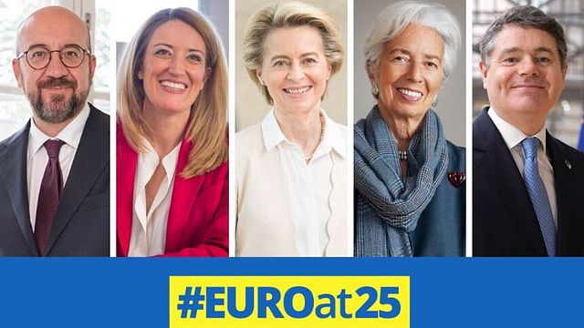 L'euro compie 25 anni. In occasione dell'anniversario, i vertici dell'Unione europea - Roberta Metsola, presidente del Parlamento europeo, Charles Michel, presidente del Consiglio europeo, Paschal Donohoe, presidente dell'Eurogruppo, Christine Lagarde, presidente della Bce, e Ursula von der Leyen, presidente della Commissione europea, hanno realizzato e diffuso un intervento congiunto. "L'euro è una parte indispensabile della nostra vita quotidiana, donandoci semplicità, stabilità e sovranità", hanno scritto i vertici europei.