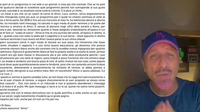 La Di Gesu rievoca l'episodio soprattutto perché, dopo settimane di critiche agli allievi, a Rudy Zerbi e ad alcuni meccanismi del programma, la goccia che ha fatto traboccare il vaso è stata la decisa smentita di Jurman su una sua volontà di tornare al talent. "Dal 2018 a fino a una manciata di mesi fa, ha telefonato decine e decine di volte, ha mandato tanti messaggi, ha cercato in ogni modo di poter rientrare a far parte del cast tecnico artistico di 'Amici'" - scrive la produttrice -. Ora non siamo in un tribunale e non si possono sbandierare i messaggi inviati di testo e di audio. Ma quei messaggi ci sono e lui lo sa, quindi noi siamo tanto pazienti, ma perché insistere?".