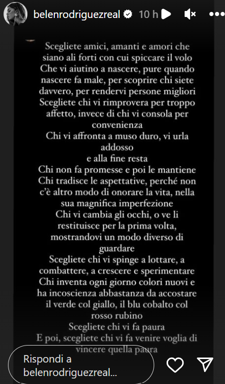 Nei giorni scorsi sui social ha confermato un flirt tra il suo ex Stefano De Martino e Alessia Marcuzzi. Secondo il settimanale “Chi” che ha ricostruito la vicenda la storia risalirebbe all’anno in cui lei era conduttrice all’Isola dei famosi e lui era l’inviato. A quei tempi De Martino era single, in un periodo di tira e molla con Belen, mentre la Marcuzzi era sposata da un anno con Paolo Calabresi Marconi, da cui si è invece separata nel 2022. Ora Belen parrebbe rivolgersi proprio al suo ex lanciando l’ennesima frecciatina social. Nelle storie ha scritto: “Scegliete chi vi rimprovera per troppo affetto, invece di chi vi consola per convenienza, chi vi affronta a muso duro, vi urla addosso e alla fine resta, chi non fa promesse e poi le mantiene, chi tradisce le aspettative, perché non c'è altro modo di onorare la vita, nella sua magnifica imperfezione, chi vi cambia gli occhi, o ve li restituisce per la prima volta, mostrandovi un modo diverso di guardare. Scegliete chi vi spinge a lottare, a combattere, a crescere e sperimentare, chi inventa ogni giorno colori nuovi e ha incoscienza abbastanza da accostare il verde col giallo, il blu cobalto col rosso rubino. Scegliete chi vi fa paura. E poi, scegliete chi vi fa venire voglia di vincere quella paura”.