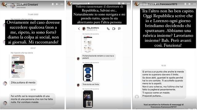Si tratta di minacce e insulti da parte di persone, anonime, che la incolpano della morte di Giovanna Pedretti. "Ovviamente nel caso dovesse succedere qualcosa (non a me, ripeto, io sono forte) diamo la colpa ai social, non ai giornali - ha scritto -. Volevo rasserenare il direttore di Repubblica, Salvini etc... Naturalmente io sono navigata e mi prendo tutto, spero lo sia altrettanto l'altra persona. Tra l'altro non ho ben capito. Oggi Repubblica scrive che io e Lorenzo ogni giorno brindiamo decidendo chi sputtanare. Abbiamo una rubrica insieme? Lavoriamo insieme? Bah. Però avanti così. Funziona!".