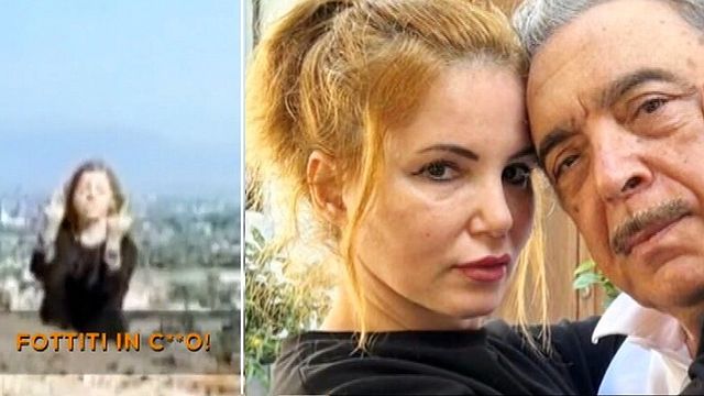 Come mostrano gli audio e i filmati mandati in onda dalla trasmissione di Mario Giordano su Rete 4, è possibile vedere come la moglie del noto attore stia rendendo impossibile la vita dei suoi vicini. In particolare in un filmato si vede la donna dopo aver lanciato una pietra alla finestra della famiglia con cui condivide il pianerottolo. Una volta, inquadrata, dallo smartphone la donna insulta la dirimpettaia: "Fottiti in c**o", esclama la donna mostrando il dito medio.