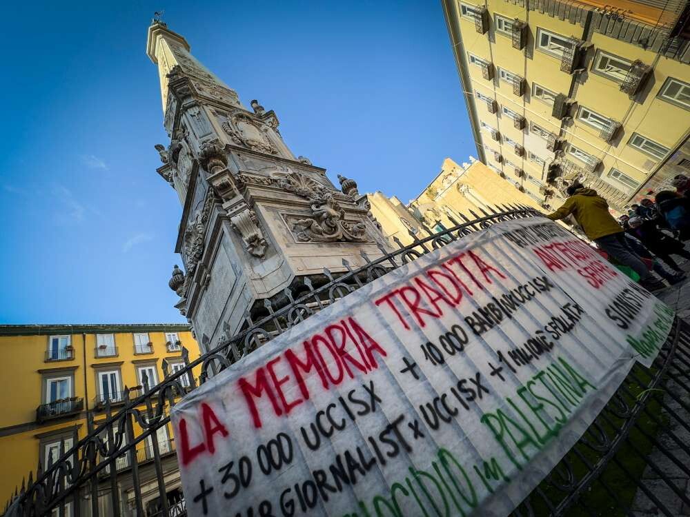 © Ansa|Presidio di solidarietà ai palestinesi ni piazza San Domenico Maggiore a Napoli