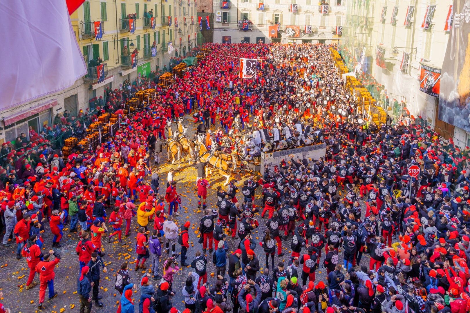 Antico è anche il Carnevale di Ivrea, la cui origine risale al 1808. Tutto si svolge secondo un ben preciso cerimoniale, che si ripete anche quest’anno secondo la tradizione, che ha preso il via il 6 gennaio e che proseguirà fino al 13 febbraio. Il clou è l’attesissima e celebra Battaglia delle Arance, replicata 3 volte nelle 3 giornate del 11, 12 e 13 febbraio, avendo come scenario le principali strade e piazze del centro. La battaglia si rifà a un fatto realmente accaduto, ovvero la rivolta popolare contro il signore locale che fu innescata dal rifiuto di una vezzosa mugnaia a sottostare alla sua pretesa dello ius prime noctis. La giovane ragazza, simbolo di eroismo e libertà, è ancor oggi l’emblema della festa. A combattersi a suon di arance sono il popolo (gli aranceri a piedi, senza alcuna protezione) e le armate del tiranno (gli aranceri sui carri, protetti da caschi di cuoio). Alla Battaglia prendono parte oltre 4000 tiratori a piedi suddivisi in nove squadre e 52 carri trainati da cavalli (36 pariglie e 16 tiratori a quattro) per un totale di circa 5000 persone coinvolte. Le arance utilizzate sono circa 600 quintali. www.storicocarnevaleivrea.it