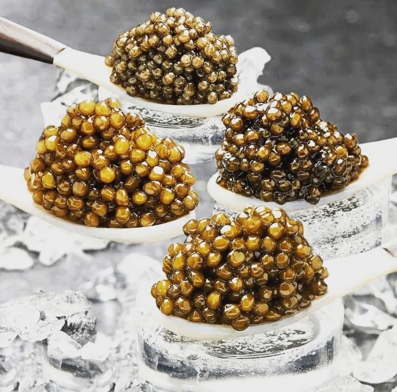 Royal Sevruga e Baerii: unione di due storioni piccoli, presenta uova grigio chiaro che scoppiano in bocca, lasciando un sapore dolce e di nocciola.
