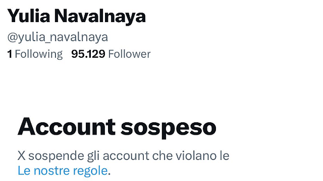 La piattaforma X di Elon Musk ha temporaneamente sospeso l'account di Yulia Navalnaya, la vedova di Alexei Navalny che ha apertamente accusato Vladimir Putin di aver ucciso il marito. "Sospendiamo gli account che violano le Regole di X", si leggeva sul social quando si cercava di aprire il profilo della donna. Profilo che è poi tornato attivo poco dopo. "Abbiamo immediatamente ripristinato l'account appena ci siamo resi conto dell'errore", ha spiegato X.