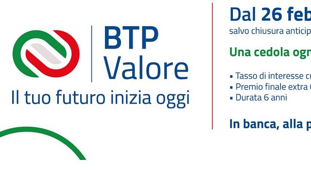 È partita lunedì 26 febbraio e si concluderà (salvo chiusura anticipata) venerdì 1° marzo alle 13 la terza emissione del Btp Valore, lo strumento finanziario di successo emesso dal Ministero dell'Economia. Lo stesso dicastero ha pubblicato per il Btp il rendimento netto previsto: tasso cedolare minimo garantito del 3,25% per il primo, secondo e terzo anno, che sale al 4% per il quarto, quinto e sesto anno. Al termine del collocamento - precisa il Mef - verranno annunciati i tassi cedolari definitivi che potranno essere confermati o rivisti al rialzo, in base alle condizioni di mercato del giorno di chiusura dell'emissione.