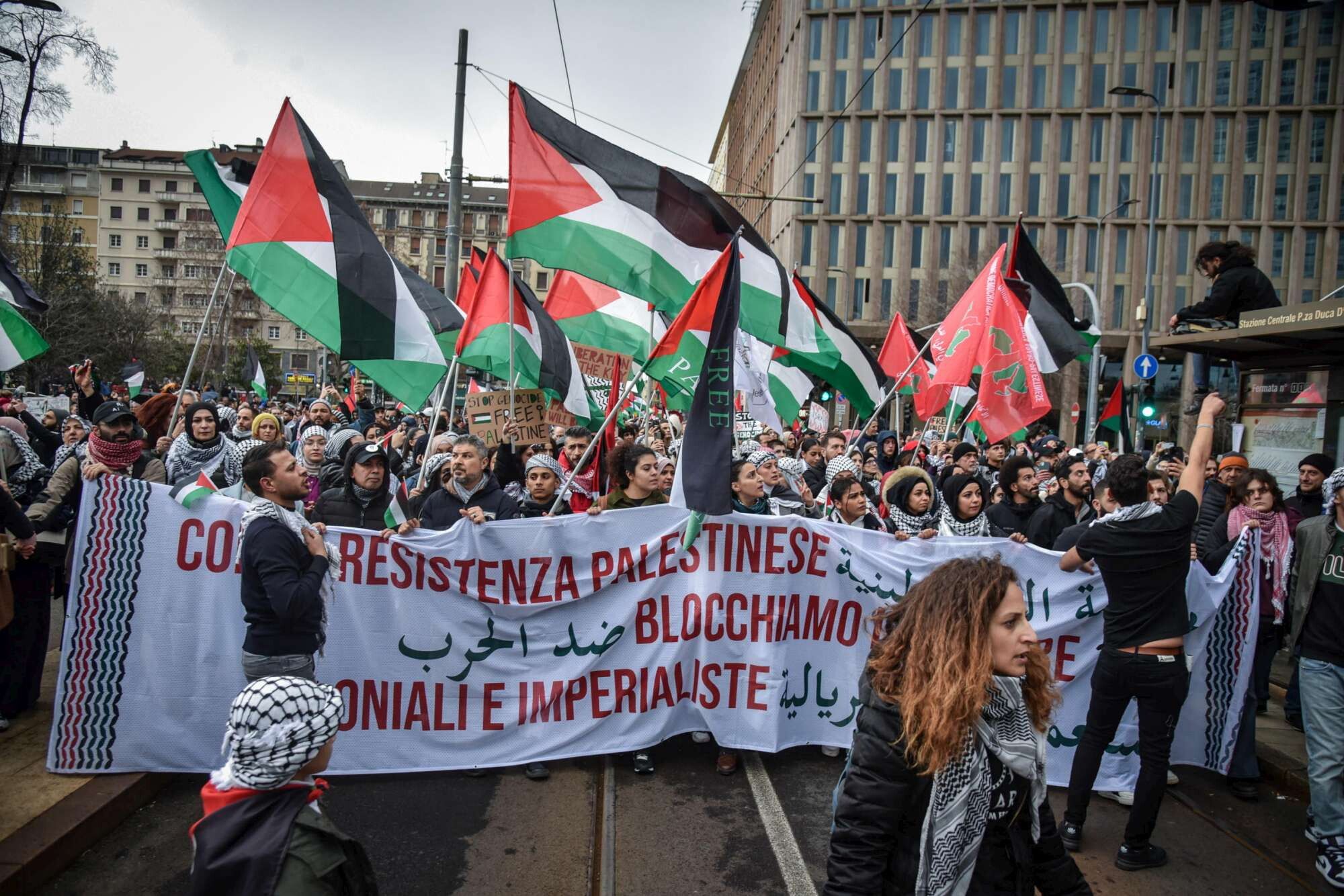 Per la Palestina e "contro il genocidio" che si sta compiendo a Gaza: in circa 15mila si sono radunati a Milano da tutta Italia per partecipare al corteo nazionale contro la guerra. Per le vie della metropoli lombarda hanno manifestato sindacati, antagonisti, associazione dei Palestinesi d'Italia e dei Giovani Palestinesi. La mobilitazione si è svolta senza problemi, anche se si sono registrati momenti di tensione quando una decina di partecipanti, con abiti neri e il volto coperto, si sono isolati all'altezza di piazzale Principessa Clotilde e hanno danneggiato un supermercato con sassi contro le vetrine. Un'agente della polizia locale si trovava su un'auto contro cui sono state lanciate le pietre ed è rimasta ferita alla testa in modo non grave.