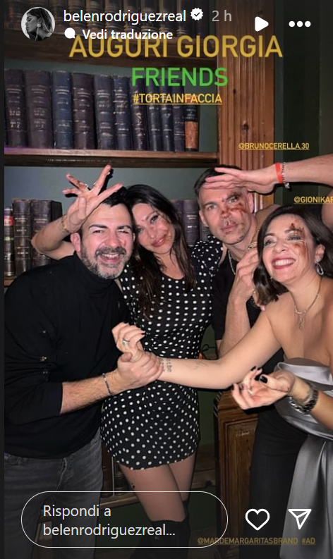 Belen Rodriguez nel weekend ha pubblicato un'immagine su Instagram in cui appare accanto a Bruno Cerella, un giocatore della Blu Basket, la squadra di Treviglio (Bergamo). I due hanno partecipato alla festa di compleanno di un’amica e Belen è stata la prima a condividere uno scatto della serata insieme in cui appare una certa intimità. Nella didascalia, ha scritto "Friends", ma non è chiaro se intendesse dire che sono solo amici o se si riferisse al suo legame con Giorgia. Anche Cerella ha ripostato la foto della cena fra amici con una bella tavolata dove si intravede anche la Rodriguez. Poi Belen ha messo nelle storie anche il video dei suoi balletti al party. Indossa un abito nero a pois bianchi molto corto che mette in mostra le sue gambe affusolate e seducenti e ancheggia sensuale davanti all’obiettivo.