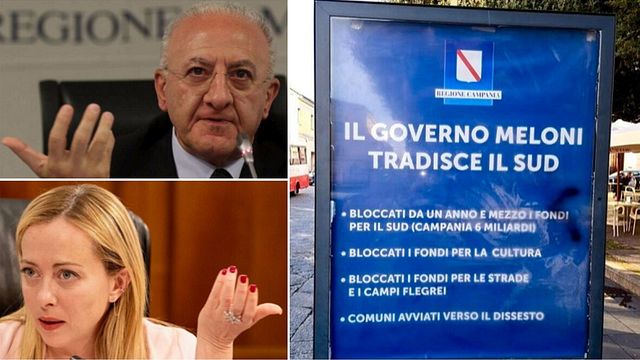 "Il governo Meloni tradisce il Sud". E' quanto si legge su alcuni manifesti contro l'esecutivo di Roma che riportano il logo della Regione Campania. I cartelloni, su sfondo blu, riportano anche l'elenco di tutti i fondi fermi: "Bloccati da un anno e mezzo i fondi per il Sud (Campania 6 miliardi)", "bloccati i fondi per la cultura", "bloccati i fondi per le strade e i Campi Flegrei", "Comuni avviati verso il dissesto". Intanto i gruppi consiliari del centrodestra in Consiglio regionale della Campania "presenteranno una interrogazione urgente sull'utilizzo distorto dei fondi della comunicazione da parte del presidente De Luca". La Lega accusa: "Uso distorto dei fondi pubblici". La replica: è una campagna di comunicazione istituzionale.