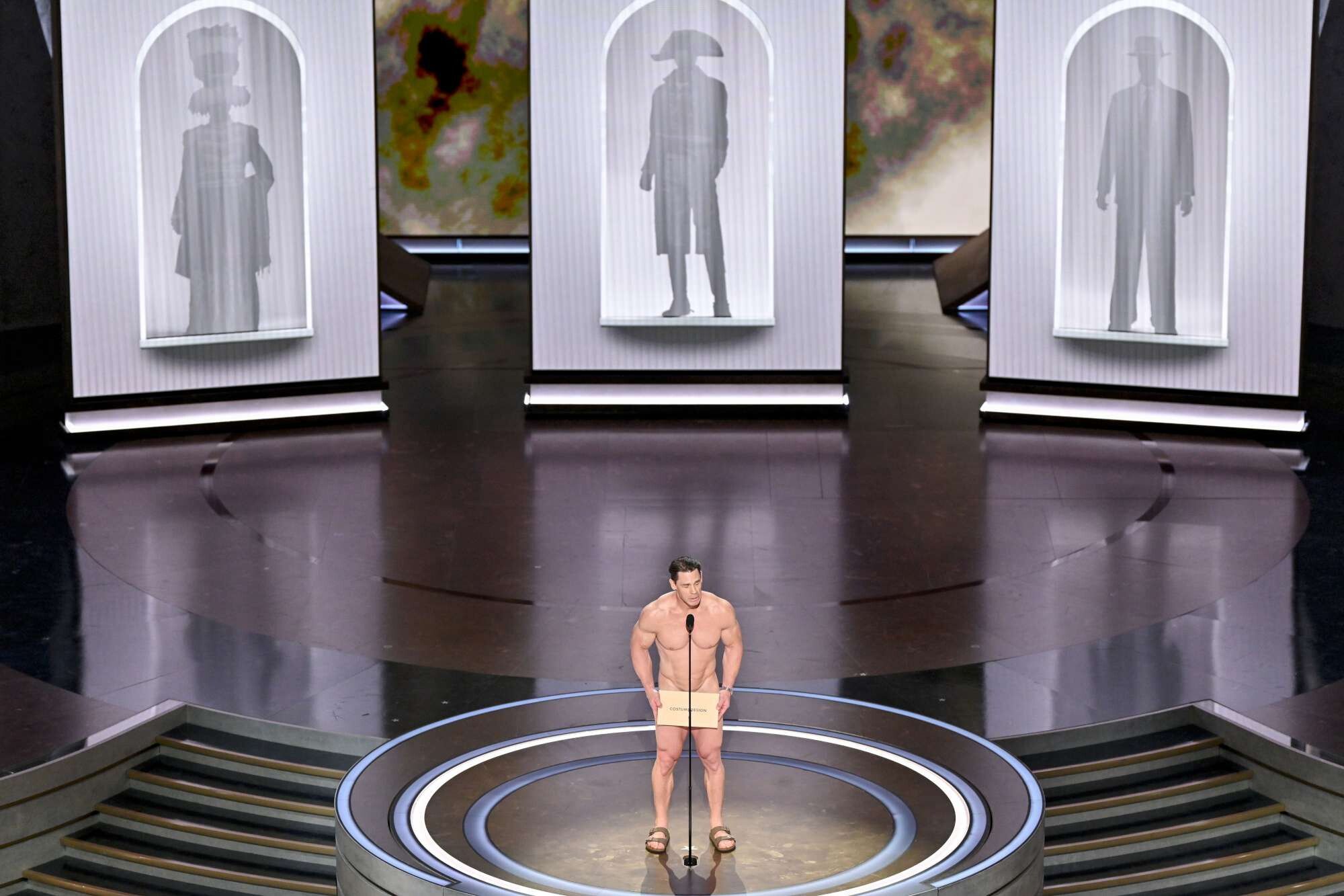 L'attore e wrestler ha interpretato il ruolo dello spogliarellista timido e dopo un siparietto con Jimmy Kimmel, in cui si è inizialmente rifiutato di uscire, si è presentato al microfono sul placo coprendo le parti intime con la busta contenente il nome del vincitore della statuetta per i migliori costumi. "Non credo di poterla aprire", ha detto l'ex stella della Wwe. E ha fatto esplodere in una risata il pubblico dicendo: “I costumi sono molto importanti...”. A quel punto Kimmel lo ha coperto con una tenda in modo che Cena potesse aprire la busta e svelare il nome del vincitore.