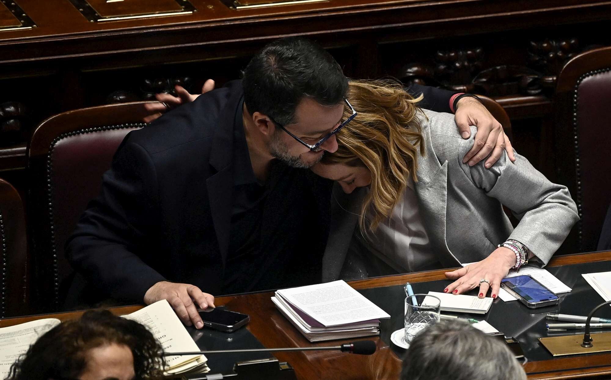 Il presidente del Consiglio Giorgia Meloni e il vicepremier Matteo Salvini sono stati immortalati mentre si abbracciano alla Camera, durante la discussione sulle comunicazioni del premier in vista del Consiglio europeo. Quando il segretario leghista ha preso posto nei banchi del governo al fianco della leader di FdI, i due si sono abbracciati sorridendo, con Meloni che ha posato la testa sulla spalla di Salvini. Poi hanno parlato tra loro. Salvini è rimasto in Aula una decina di minuti. Sull'Ucraina il capo del governo aveva affermato: "Mi si dice di parlare con Orban e con Salvini per chiarire il sostegno a Kiev. In entrambi i casi contano le decisioni e i voti. L'esecutivo ha una posizione chiara".