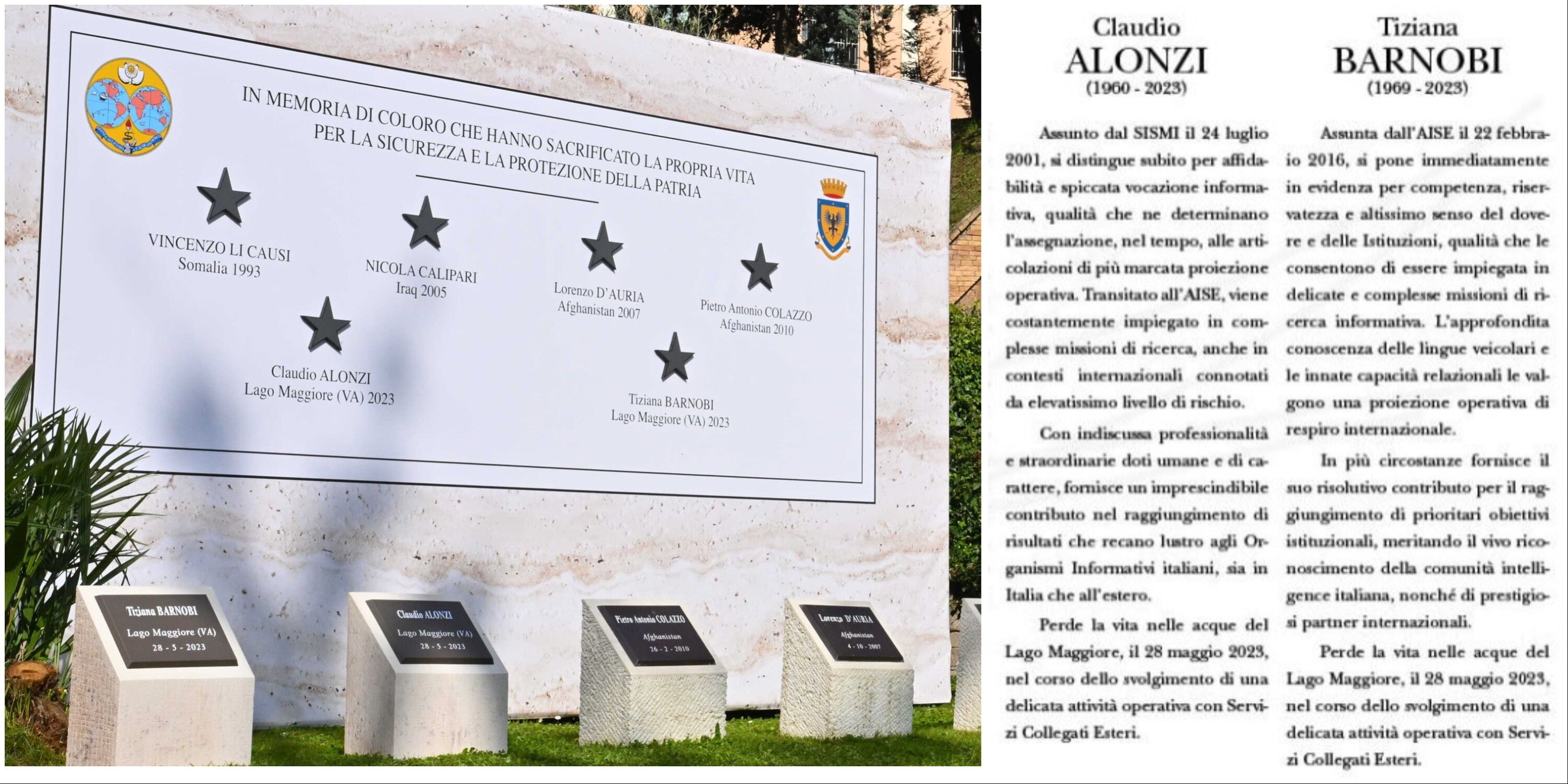E' grazie alla targa dedicata ai due agenti segreti Claudio Alonzi e Tiziana Barnobi, morti nel naufragio di un anno fa nelle acque del Lago Maggiore, che per la prima volta viene confermato che i due 007 erano in "servizio in una delicata missione operativa" e non fossero lì solo per una festa di compleanno tra colleghi italiani e del Mossad. "Perde la vita nelle acque del lago Maggiore il 28 maggio nel corso dello svolgimento di una delicata attività operativa con servizi collegati esteri", la scritta apposta sulla targa.