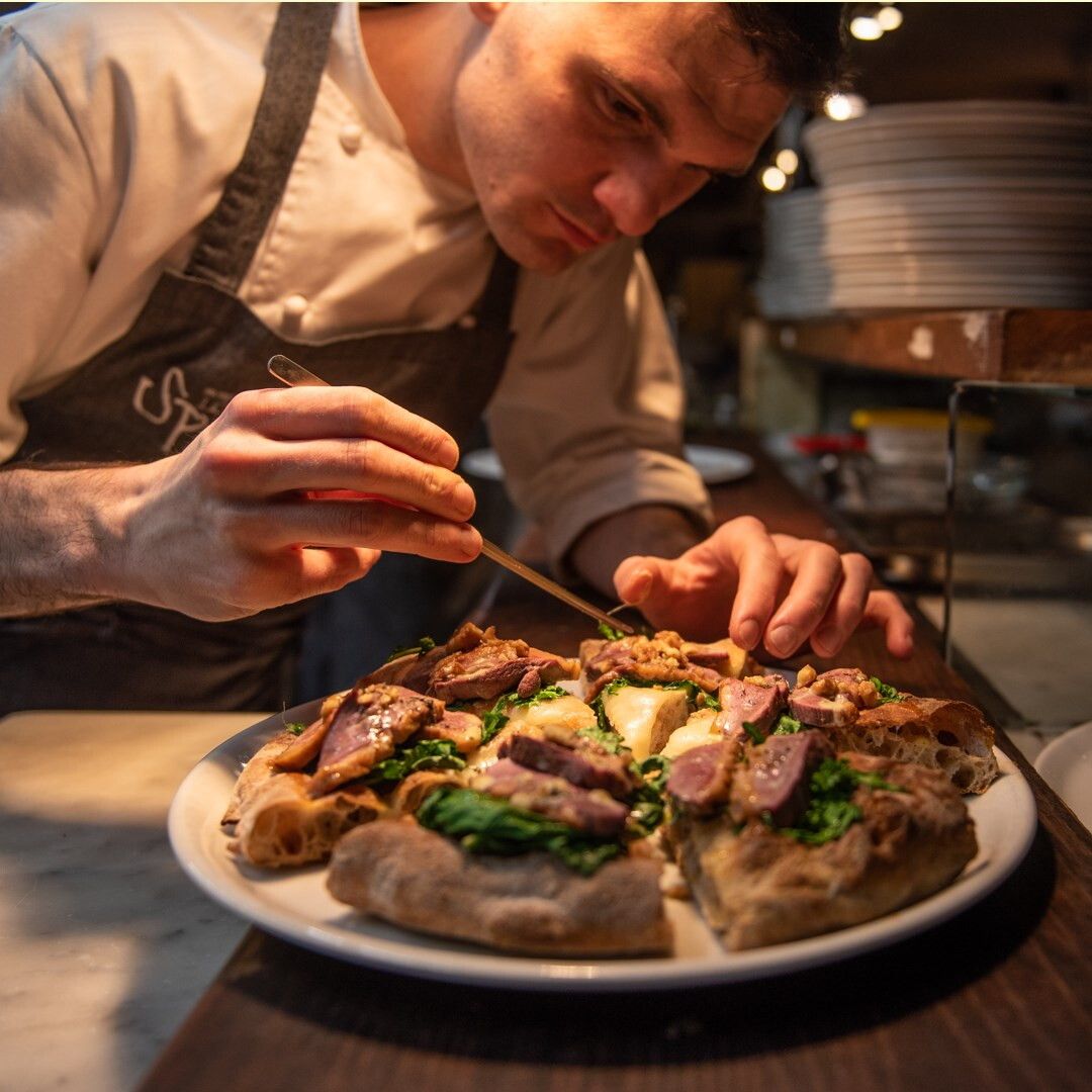 Nella prestigiosa categoria “pizze dell’anno” della guida del Gambero Rosso 2022, che riconosce l’indimenticabile creazione di un abbinamento riuscito, Lo Spela a Greve in Chianti (FI), con la sua Petto d’Anatra ha ricevuto il premio più ambito. La pizza in questione, realizzata da Tommaso Mazzei, si compone con petto d’anatra cotto a bassa temperatura, fiordilatte, spinacino fresco, salsa al whisky. Una base alla romana, croccante all’esterno e morbida all’interno, accoglie una cima di rapa cotta al cartoccio che fa da letto al protagonista principale: il petto d’anatra, valorizzato da un battuto di carote viola e un ristretto al whisky aromatizzato da erbe e spezie. Un nuovo classico ormai intramontabile, che si può trovare in carta, da gustare ogni volta che si vuol comprendere che la pizza è molto di più di quello a cui siamo abituati a pensare, e che può significare veri e propri piatti fine dining serviti sul lievitato.