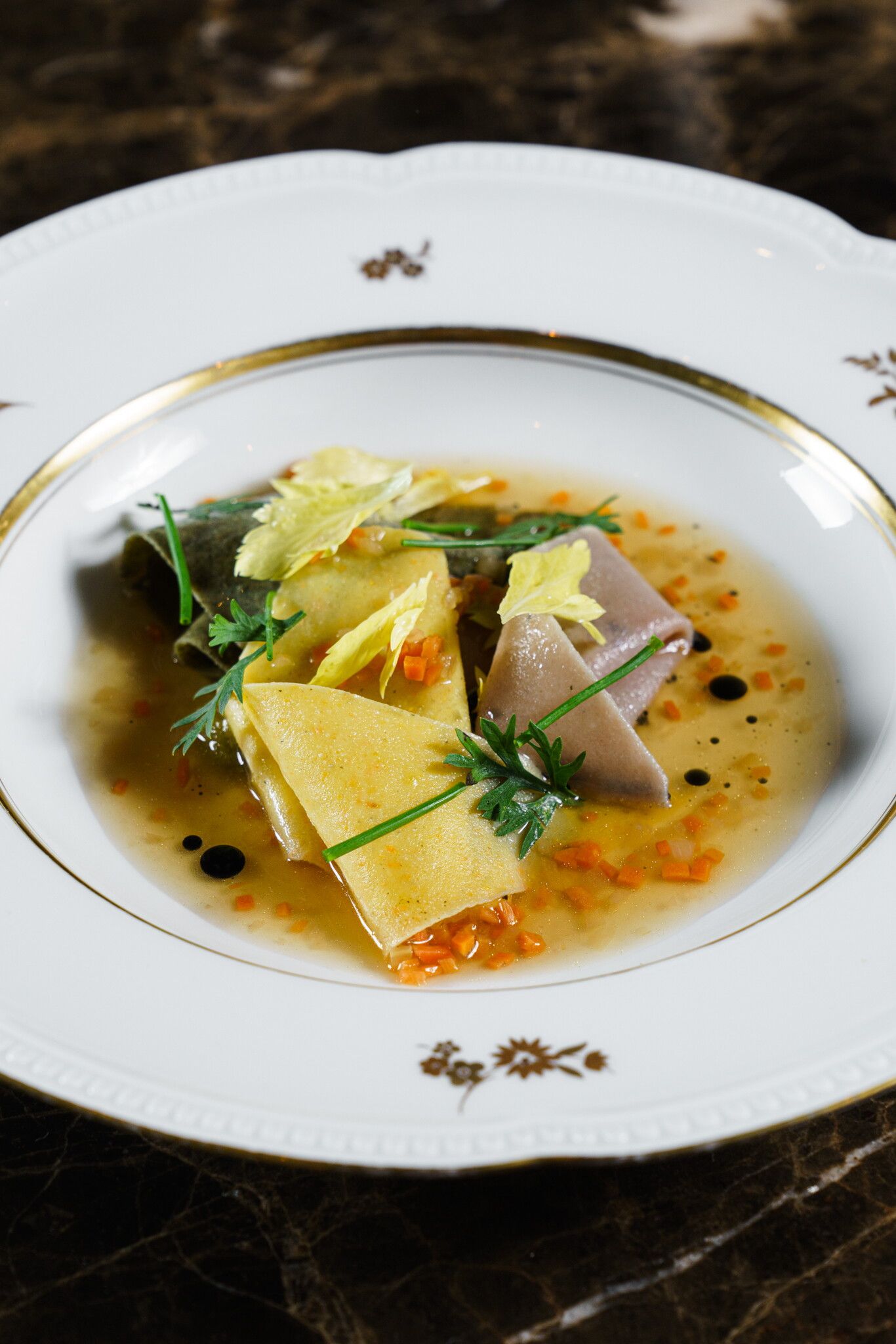 Oppure le “Trenette” dove i ricci di mare si nascondono nella struttura stessa della pasta creando l'illusione di un mare che si sente ma non si vede, mentre il brodo di grigliata mista su cui poggia rende omaggio al coraggio dell’osare, portando una ricchezza gustativa che parla di terra ferma come se fosse la prima costa raggiungibile dopo un lungo viaggio in questo mondo paradossale dove il mare è solido e la terra è resa liquida.