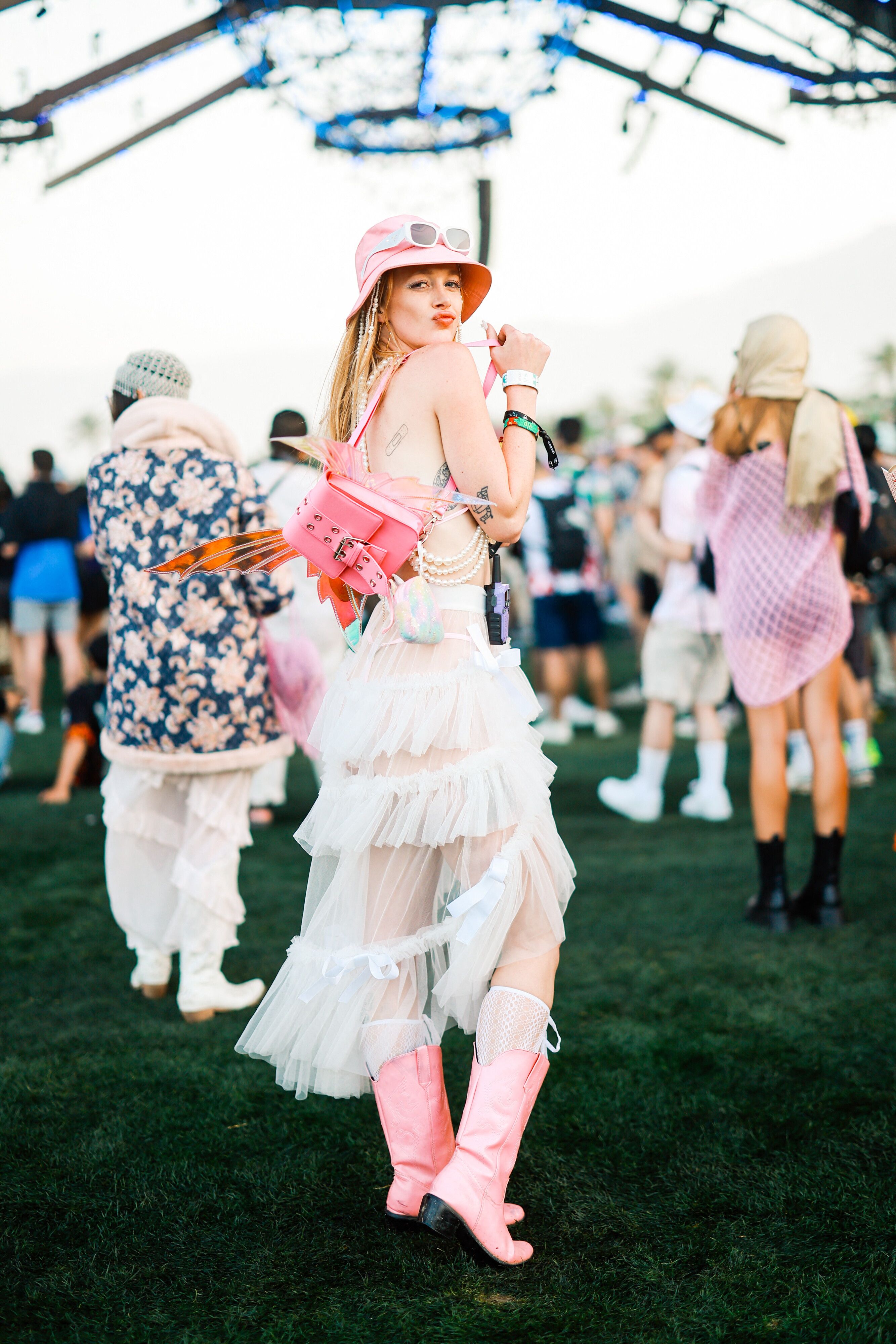 Al Coachella si va vestiti da Coachella. Vale a dire con un look tra il boho-chic e l’hippie, ricco di rimandi navajo, accenti futuristici, accessori griffati e stivali camperos. Il make up del pubblico di uno degli eventi musicali più attesi dell’anno e sempre più glamour - i festivalgoer - è deciso e coloratissimo, le acconciature estrose ed elaborate. Vanno alla grande anche stampe, tocchi fluo e psichedelici, cascate di cristalli.