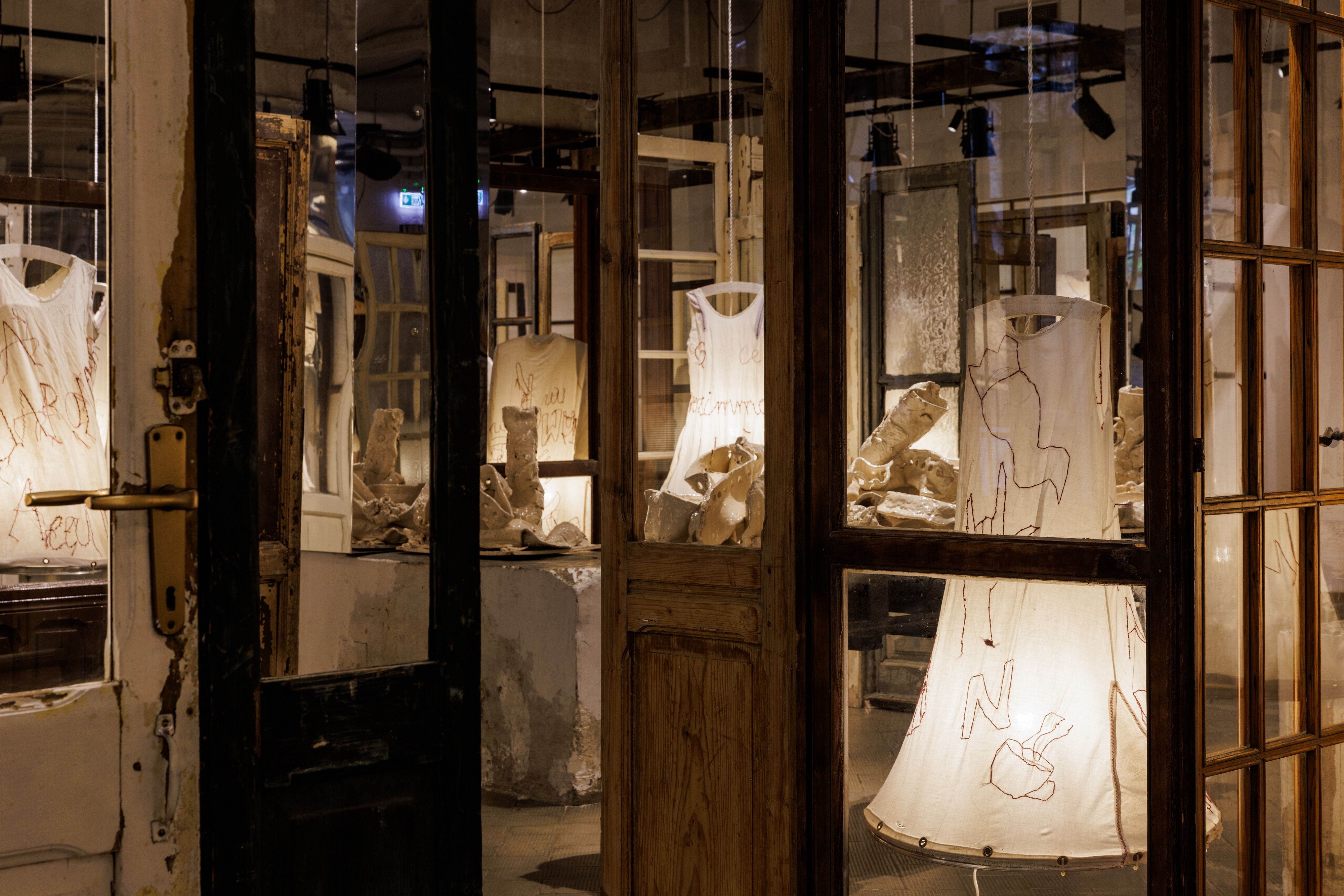 Da non perdere le esposizioni installate nel seminterrato dello showroom. Ad accogliere per prima i visitatori, quella caratterizzata dalla simulazione artistico-prospettica di un labirinto di porte vetrate di legno consunto, che ne rappresentano il perimetro e orientano il percorso. Ogni angolo del gomitolo d’arte immaginato da Marras è presidiato da camicie da notte ricamate a mano, in lino risalente agli anni Venti e Trenta del secolo scorso. Appese a una gruccia, sono attraversate da un cavo elettrico e, al loro interno, custodiscono lampade che scendono dal soffitto fino ad altezza d'uomo. Suggestioni, quelle delle lampade e delle porte vetrate, che hanno ispirato già in passato Antonio Marras nella realizzazione di 200 lanterne e 150 "Orfanelle", confezionate in collaborazione con gli studenti dell’Accademia di Belle Arti di Napoli in occasione di “Napoli Contemporanea 2023. Open. L’arte in centro” e della mostra “Nulla dies sine linea” esposta alla Triennale di Milano.