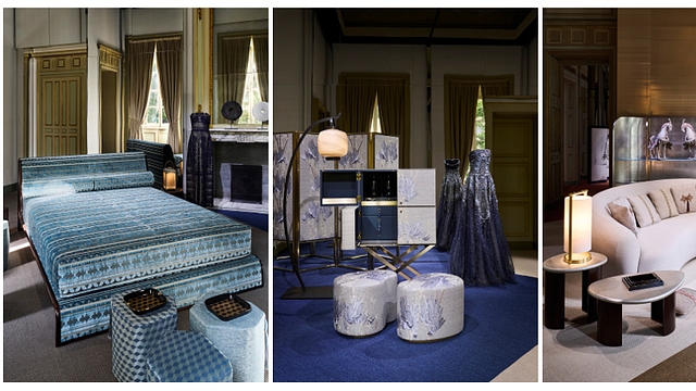 Il viaggio ideale di Echi dal mondo conduce il visitatore attraverso le terre d’ispirazione, identificabili dai rimandi alle diverse culture estetiche e vestimentarie. I riferimenti all’Europa si ritrovano nella essenzialità delle linee e ai giochi di trasparenze e di luce del tavolo TROCADERO con gambe in plexi e piano con texture onde lacca platino e delle SOFIA, che sembrano scomparire, così come la riedizione del mobile RIESLING, in plexi canneté. Il boudoir, come un piccolo scrigno, accoglie l’abito gioiello, dalla forma scultorea e impreziosito da migliaia di finissime applicazioni. L'attenzione per le texture e i dettagli delle armature dei Samurai, che lo stilista aveva in passato sintetizzato in una storica collezione ispirata a Kagemusha e rappresentata dall’abito d’archivio esposto, si ritrova nel prezioso mobile contenitore VIRTÙ, nella maniglia che si ispira all’impugnatura della katana e negli interni effetto stuoia con grafiche personalizzate.