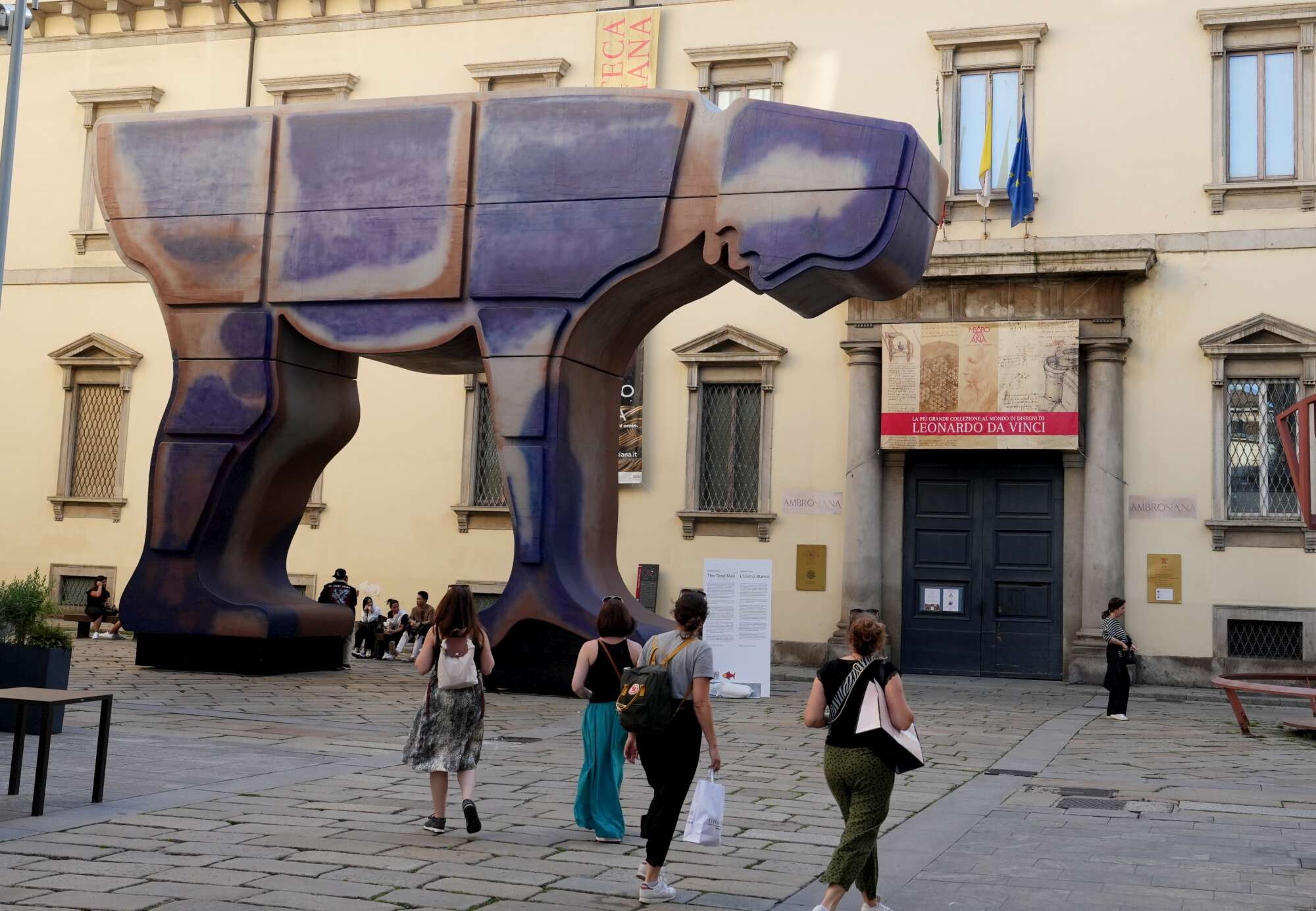 Ad accogliere i visitatori è l'enorme installazione dell'Uomo stanco in piazza Pio XI, davanti al complesso che ospita la Biblioteca e la pinacoteca, otto metri d'altezza per una creatura inginocchiata, che mostra le debolezze del sesso forte. Negli spazi all'ingresso dell'Ambrosiana è invece allestita la mostra "Nice to see you", ovvero piacere di vederti, che raccoglie alcuni classici ma soprattutto opere realizzate nel 2023 e 2004.