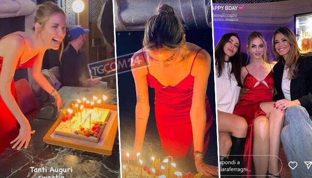 Chiara Ferragni festeggia per tutta la giornata il suo 37 compleanno, ma il party più scintillante è quello della sera con Diletta Leotta e le amiche più intime. Va in scena in un locale milanese con tanto di torta con le candeline e atmosfera da sballo. L’influencer sfoggia un abito rosso a sottoveste con due rose in seta a coprirle il seno e sfodera sorrisi e abbraccia tutti gli invitati.