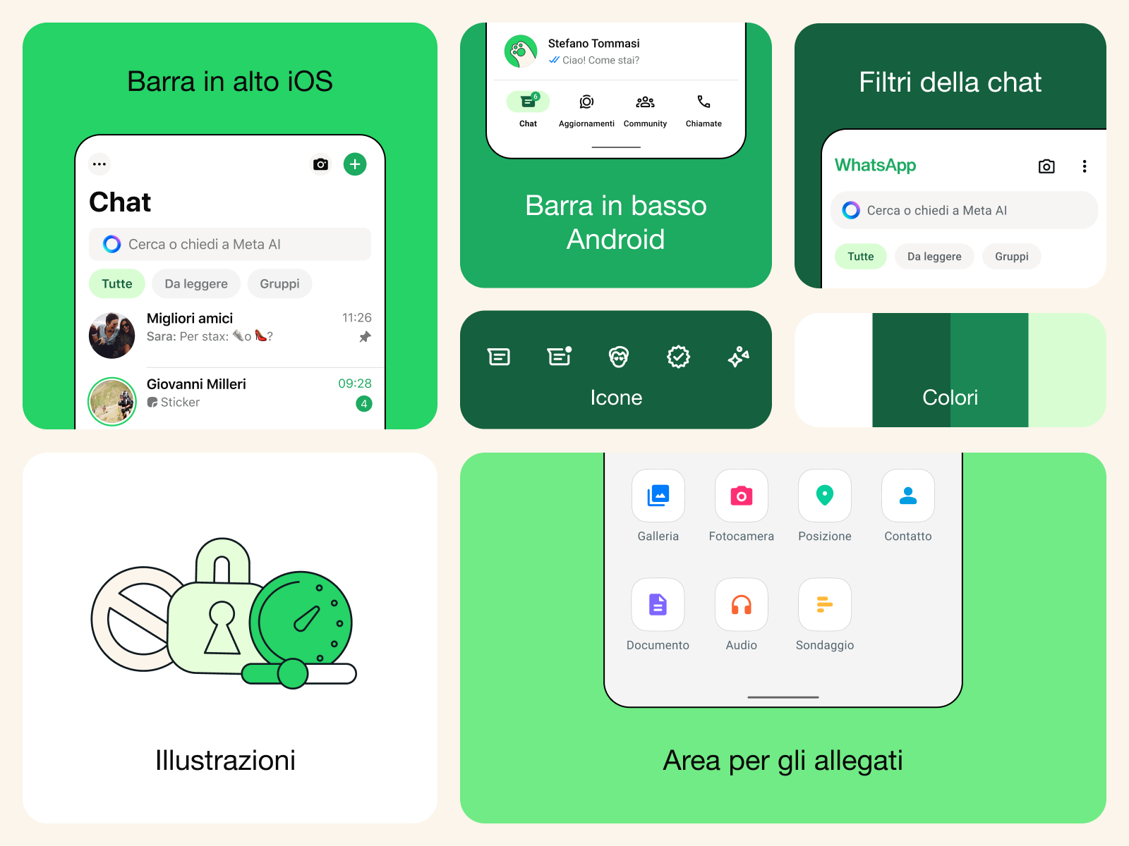 Icone e illustrazioni Aggiornate, anche, le icone con uno stile arrotondato e stilizzato. Per creare un equilibrio con la nuova iconografia, sono state rinnovate, inoltre, le illustrazioni e aggiunte animazioni per creare un'estetica più giocosa. Rivisto anche lo sfondo della chat, soprattutto la versione predefinita, maggiormente utilizzata dagli utenti.