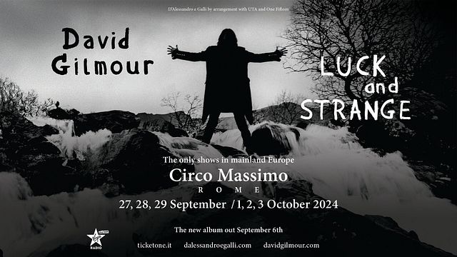 David Gilmour torna in Italia dopo otto anni d'assenza, con sei date a sostegno del suo nuovo album “Luck and Strange” in uscita il prossimo 6 settembre. Gli spettacoli, che si preannunciano già come uno degli eventi live più importanti del 2024, sono in programma il 27, 28 e 29 settembre e l'1, 2 e 3 ottobre al Circo Massimo di Roma. Saranno l'anteprima mondiale del tour e gli unici spettacoli nell'Europa continentale.