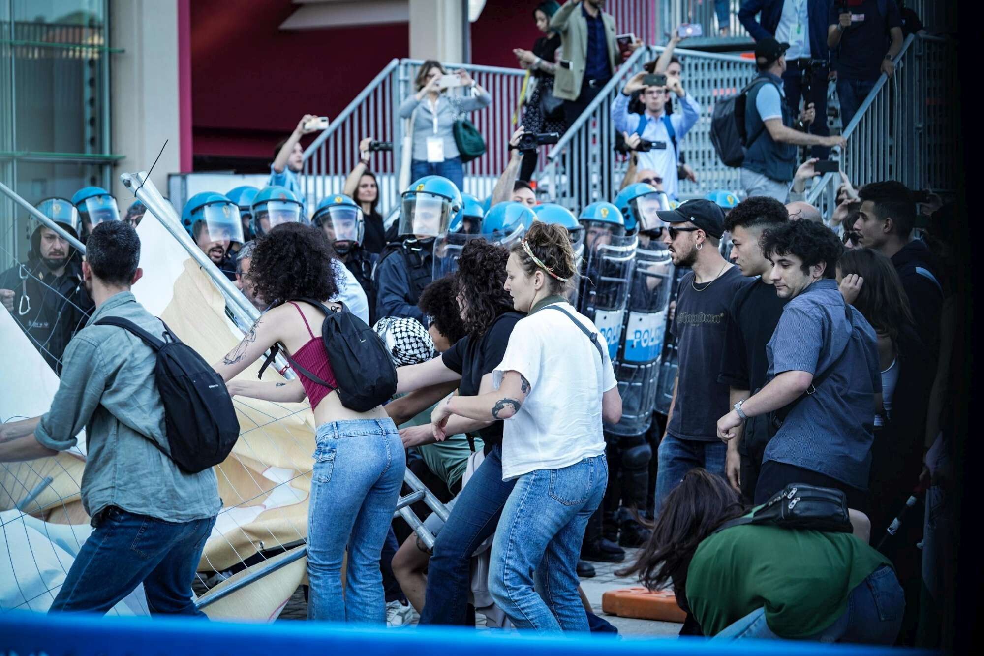 Alcuni degli attivisti alla manifestazione pro Palestina "tutti gli occhi su Rafah" hanno aperto con la forza i cancelli di sbarramento all'ingresso del salone del libro di Torino per provare ad entrare. Sono stati respinti dalla polizia con gli scudi e con i manganelli. Il salone del libro è una m... sionista" hanno detto i manifestanti, che hanno preso a calci le transenne intorno all'entrata principale. La polizia è poi riuscita a respingere i manifestanti e a riportare la calma.
