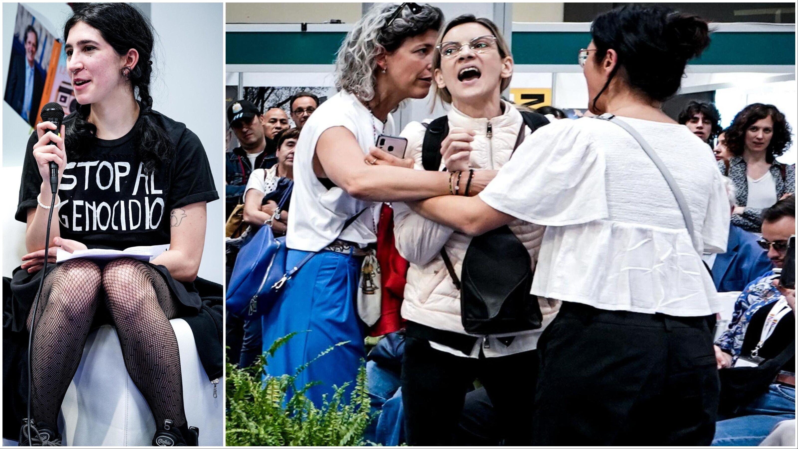 Sulla t-shirt nera che indossa la scritta "Stop al genocidio", i capelli raccolti in trecce, Elena Cecchettin è emozionata mentre legge il suo monologo. In prima fila ad ascoltarla il padre Gino Cecchettin, al Salone con "Cara Giulia" (Rizzoli), il libro scritto con Marco Franzoso. Il pubblico la ascolta in silenzio, poi inizia un dialogo con Alessandra Chiricosta su Resistenza femminista: la forza di liberare il proprio spazio e irrompe sulla scena una contestatrice che urla "Vade retro Satana. Il patriarcato è un insulto in confronto a voi. Le bestie hanno mantenuto l'istinto materno, voi invece uccidete i vostri figli" con un rosario in mano. Allontanata, la contestatrice poi ritorna: "Giù le mani dai bambini. Non si uccidono".