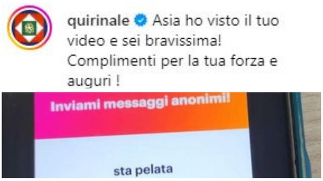 Una ragazza di 14 anni, Asia, di Sala Consilina, in provincia di Salerno, da tempo combatte contro un tumore ed è in cura presso il reparto di Oncologia pediatrica dell'ospedale Santobono - Pausillipon di Napoli. Tuttavia, nelle ultime settimane, oltre alla malattia, si è trovata a dover affrontare anche una brutta vicenda di bullismo sui social. La ragazza ha trovato la forza di rispondere agli hater e la sua storia è diventata virale. Tanto che, su Instagram, le è arrivato un incoraggiamento da un utente speciale: il presidente della Repubblica. Il Capo dello Stato, tramite il profilo del Quirinale, ha commentato un video in cui Asia suona il pianoforte pubblicato dalla Fondazione Santobono - Pausilipon, scrivendo: "Asia, ho visto il tuo video e sei bravissima! Complimenti per la tua forza e auguri! Sergio Mattarella".