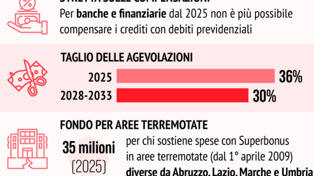 Per le banche, dal 2025, non sarà più possibile compensare i crediti del Superbonus con debiti previdenziali e i premi per l'assicurazione contro gli infortuni sul lavoro e le malattie professionali. Vige per gli istituti finanziari, non per le persone fisiche.
