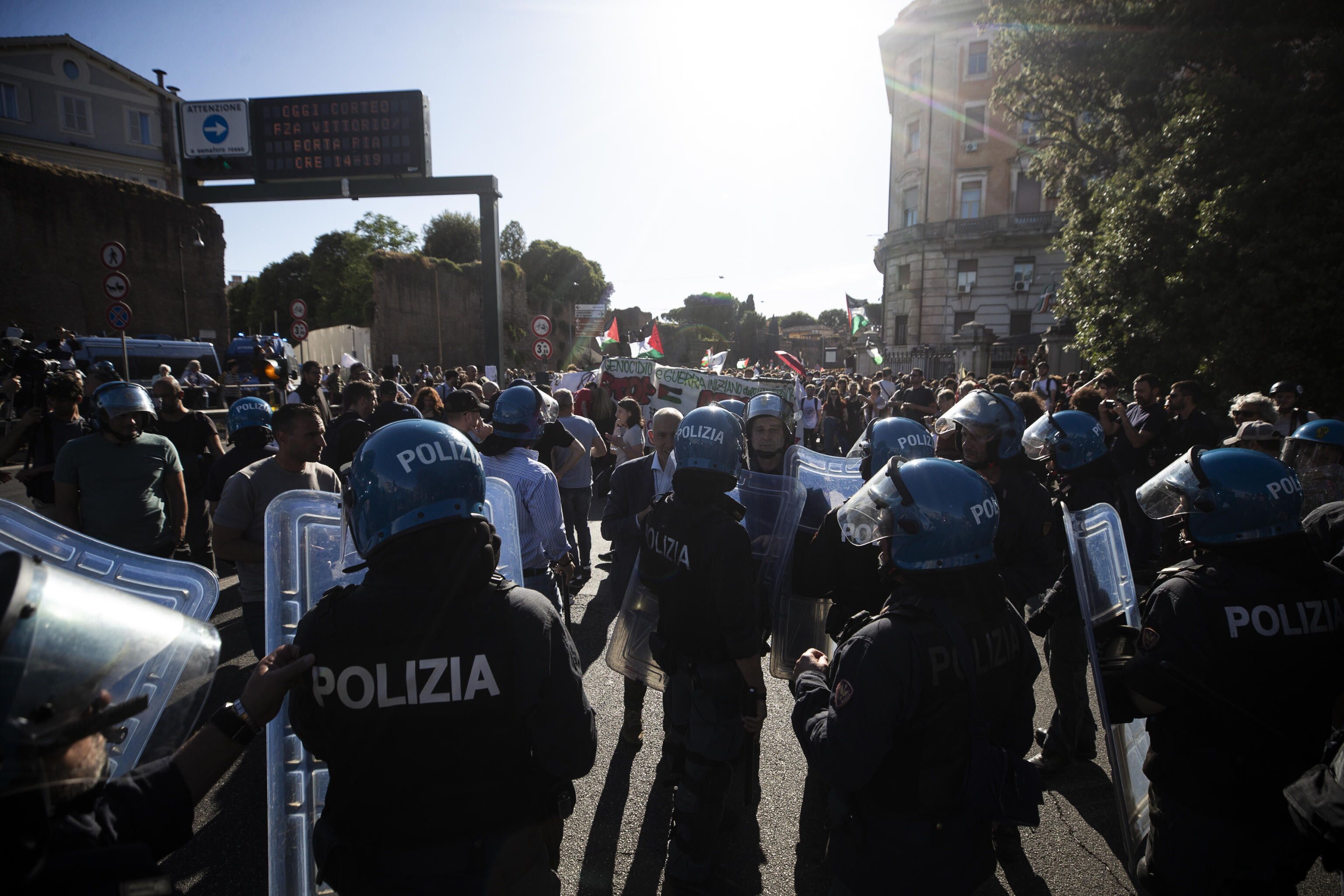 I militanti che hanno tentato di uscire dal percorso sono stati fronteggiati dalle forze in assetto antisommossa e respinti con gli scudi. Il corteo è stato organizzato per contestare il governo Meloni nel giorno in cui il premier ha tenuto nella Capitale il suo comizio finale in vista delle Europee.