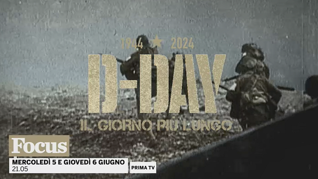 Su Focus mercoledì 5 giugno, dalle 21:05 - "D-Day - Il giorno più lungo" (D-Day 360) resoconto puntuale e quasi in presa diretta dello sbarco in Normandia. - "6 Giugno '44 - Attacco all'alba!" (6 June ‘44 - The Light of Dawn) mette in fila i preparativi diplomatici e militari dello sbarco e quello che accadde in seguito: l’avanzata verso Parigi. Dalla genesi dell'Operazione Overlord, concepita nel 1941 da Churchill e Roosevelt, alle strategie di Hitler per prevenirla e contrastarla. Un’analisi geopolitica, con l’alleanza Londra, Mosca, Washington, e militare-industriale, che non dimentica i combattenti anonimi di una partita a scacchi in cui era in gioco il destino del mondo. Giovedì 6 giugno, dalle ore 21:05 - "D-Day - Sulle ali della Vittoria" (D-Day Wings of Victory) racconta il ruolo centrale dell’aviazione nella riuscita dello sbarco - "Come ingannare i tedeschi - Storia dell'Armata Fantasma" (The Ghost Army) descrive tecniche e stratagemmi di deception, posti in atto prima e durante lo sbarco. - "Provenza, Agosto 1944: l'altro D-Day" (Provence, August 1944: The Other D-Day) mette in luce lo sbarco meno noto: quello in Provenza, diretto verso Berlino, allo scopo di impegnare i tedeschi su un secondo fronte.