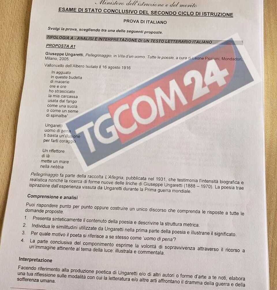 Maturità 2024, ci siamo. Passata la notte prima degli esami, alle ore 8:30 di mercoledì 19 giugno è partita la prima prova. Le tracce di analisi del testo (Tipologia A) riguardano il brano di Luigi Pirandello "Quaderni di Serafino Gubbio operatore" e la poesia "Pellegrinaggio" di Giuseppe Ungaretti. Le tracce di analisi e produzione di un testo argomentativo (Tipologia B) si incentrano su: un testo tratto da "Storia d'Europa" dello storico Giuseppe Galasso, che invita i maturandi a riflessioni sull'uso dell'atomica; l'importanza della Carta costituzionale in un testo di Maria Agostina Cabiddu; "Riscoprire il silenzio" della giornalista Nicoletta Polla-Mattiot; una traccia geopolitica legata al contesto internazionale e alla storia recente e meno recente, sul cosiddetto "equilibrio del terrore". Per quanto riguarda la Tipologia C (Riflessione critica di carattere espositivo-argomentativo su tematiche di attualità), sono stati proposti ai maturandi "Elogio dell'imperfezione" di Rita Levi Montalcini e "Profili, selfie e blog" di Maurizio Caminito. I 526mila maturandi alle prese con gli esami di Stato avranno a disposizione 6 ore. Le tracce sono dunque in tutto sette, tre invece le tipologie di prova: analisi del testo, testo argomentativo e tema d'attualità. "I maturandi troveranno interessanti le tracce d'esame", ha detto il ministro Valditara, spiegando che "sono state scelte a marzo".