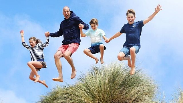 L'immagine diffusa in occasione della ricorrenza del principe William cattura il futuro monarca in un momento di gioia, mentre si lancia in un salto con i suoi tre figli, i principini George, Charlotte e Louis. La didascalia, "Buon compleanno papà, sei il nostro eroe!", è stata affettuosamente aggiunta da Kate Middleton. Nella foto, la famiglia appare rilassata e sorridente, vestita in modo informale, con William in felpa e shorts, immortalati dalla Principessa del Galles a Norfolk. La scena ricorda una giornata estiva trascorsa in spiaggia, simile allo sfondo utilizzato da Kate per un precedente scatto dedicato al marito per la festa del papà. Sulla destra, Charlotte si distingue per la sua maglia a righe, sollevando un braccio in segno di festa, mentre un più riservato Louis si aggrappa alla mano del padre, guardando verso il basso. Sul lato sinistro, un radioso George saluta l'obiettivo con entusiasmo.