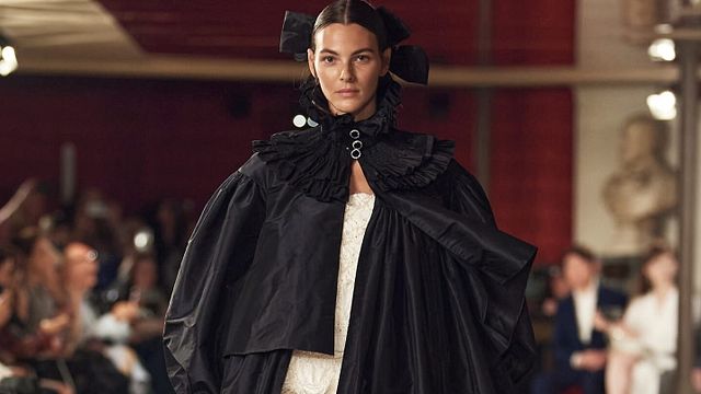 Sofisticata, lussuosa, teatrale: la nuova collezione degli abiti più preziosi della maison è il frutto del lavoro collettivo dei suoi creativi dell'ufficio stile. Riccamente ricamata, si rivela nei corridoi esterni circostanti l'auditorium, trasformati per l'occasione in palchi di velluto rosso. Qui i mondi della Haute Couture e dell'opera si mescolano: piume, nappe, l’arte del cabochon e fiori ricamati, trecce preziose, jersey laccato, morbidi tweed, velluto setoso, tulle trasparente, taffetà e raso duchesse. I volumi sono diafani, le maniche gonfie e le balze pieghettate.