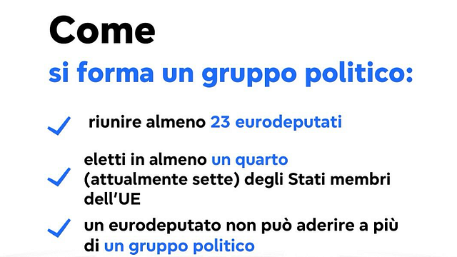 Come si forma un gruppo politico - Innanzitutto, i gruppi vengono chiamati politici proprio perché sono organizzati per affinità politiche e non per nazionalità. Ognuno di essi deve essere composto da almeno 23 deputati e rappresentare almeno un quarto degli Stati membri. Inoltre, un europarlamentare non può aderire a più gruppi politici.