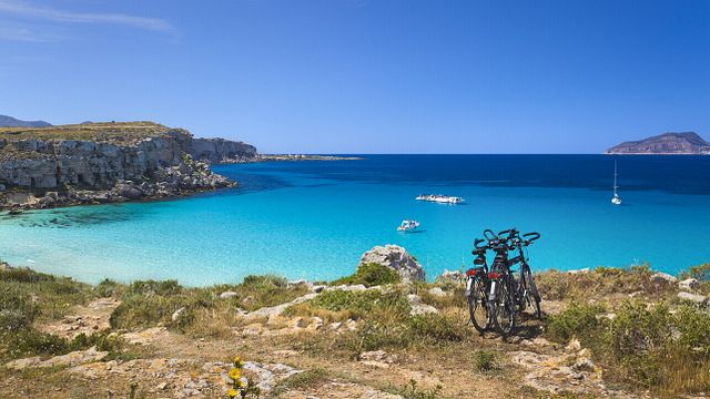 Saliamo in sella ad una bici, le più datate sono le più richieste, appena approdati al porto di Favignana dopo mezz’ora di aliscafo da Trapani. Solo con quella il nostro viaggiatore potrà raggiungere tutti i punti dell’isola. A ridosso del porto si trova il piccolo centro abitato, brulicante di gente la sera dopo il tramonto fra via Vittorio Emanuele, via Roma e piazza Madrice; le spiagge, che sono insenature rocciose o calette non immediatamente accessibili, richiedono tempo e calzature adeguate per essere conquistate. L’isola è percorsa da numerosi sentieri bianchi pedalando sui quali, dal porto verso sud ovest, si arriva a Cala Azzurra. Qui lo scenario mozzafiato ruba la scena alle più gettonate località caraibiche: la cala è poco estesa, circostanziata da rocce piatte su cui ci si può sdraiare prima di entrare nell’acqua cristallina. Il fondale è poco profondo per qualche centinaio di metri dalla battigia ed è bianco per l’erosione della costa calcarea, tale da creare un effetto cromatico spettacolare.